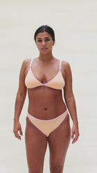This bralette is made from a super soft and lightweight organic Pima cotton blend (95% organic Pima cotton + 5% spandex). It is super comfortable and supportive. It has adjustable straps that provide an adequate breast support. This shade of peach is achieved by using fiber reactive dyes, generating a pretty low impact on the environment. It has top-quality blush elastics.