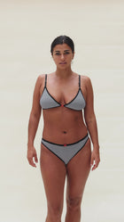 This shade of black and white is achieved by using fiber reactive dyes, generating a pretty low impact on the environment. It has top-quality black elastics. Red ribbon detail.