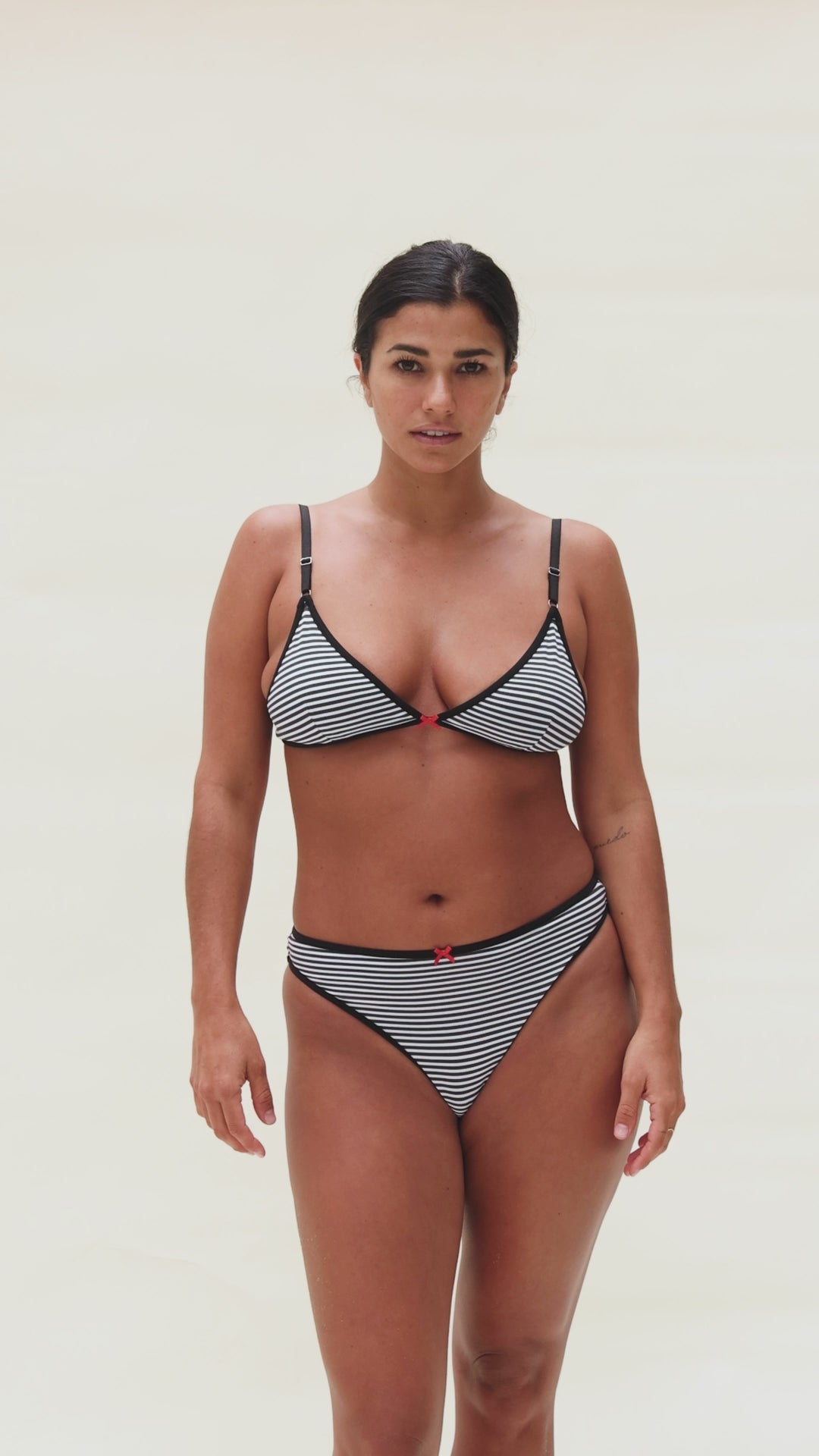 This shade of black and white is achieved by using fiber reactive dyes, generating a pretty low impact on the environment. It has top-quality black elastics. Red ribbon detail.