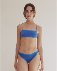 Our FREDDY BIKINI PANTY (Princess Blue + Brilliant Blue) is made from a super soft and lightweight organic Pima cotton blend (95% organic Pima cotton + 5% spandex). These shades of blue are achieved by using fiber reactive dyes, generating a pretty low impact on the environment. It has top-quality blue elastics.