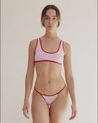 Our LUISA THONG PANTY (Pink Lady + Chili Pepper) is made from a super soft and lightweight organic Pima cotton blend (95% organic Pima cotton + 5% spandex).