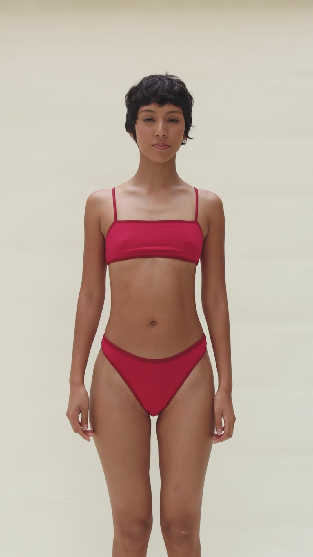This bralette is made from a super soft and lightweight organic Pima cotton blend (95% organic Pima cotton + 5% spandex). It is super comfortable and supportive. It has adjustable straps that provide an adequate breast support. This shade of red is achieved by using fiber reactive dyes, generating a pretty low impact on the environment. It has top-quality wine color elastics.